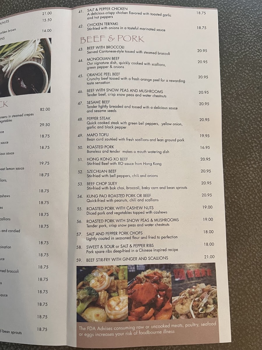 Chicken, beef, and shrimp stir-fried with green and white onions in a Mongolian sauce.